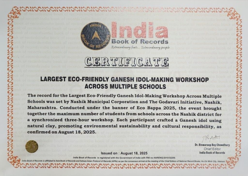 नाशिक महानगरपालिका व द गोदावरी ईनीशेटीव्ह स्वयंसेवी संस्था यांच्या संयुक्त विक्रम नाशिक शहरातील १२० शाळांमध्ये १६००० विद्यार्थ्यांनी शाडू मातीचा गणपती बनविण्याचा विक्रम प्रस्थापित केला.